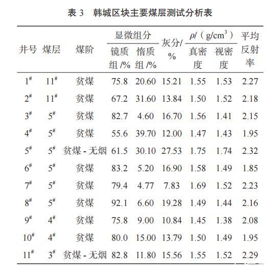 破碎程度可以通過測井資料來判斷,煤層的聲波小,密度大,則煤層的破碎程度不高,整體性好;反之聲波大,密度小則煤層破碎程度高,松散,呈碎煤或碎粒煤;測井曲線反映煤層的聲波時差一般在370~410μs/m、密度測井值為1.28~1.7g/cm3。表4為韓城區塊主要目的層聲波時差、密度測試分析結果,可以看出韓城區塊聲波偏高、密度中等,說明其煤層整體表現破碎程度較高、整體性較差。
