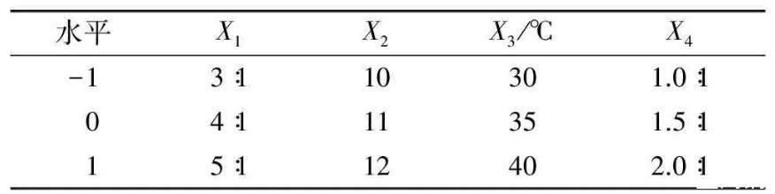 以單因素試驗為基礎,固定反應時間為2 h,以N-椰子油酰基復合氨基酸產率為響應值(Y),復合氨基酸溶液與椰油酰氯體積比(X1)、pH(X2)、反應溫度(X3)、丙酮與復合氨基酸溶液體積比(X4)為影響因素,根據Box-Behnken的試驗設計原理,通過SAS軟件對試驗數據進行回歸分析,確定最佳工藝。響應面試驗因素水平見表1,響應面試驗方案及結果見表2,回歸方程方差分析見表3。
