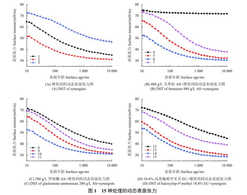 測定結果如圖1(A)所示:處理2降低表面張力的速度最快,且在10 000 ms時表面張力達到最小值,處理3降低表面張力的速度最慢,說明2#增效劑的效果最好,3#增效劑最差。與未添加增效劑的處理(4,8,12)相比,添加增效劑后除草劑表面張力的降低速度更快,10 000 ms時所達到的靜態表面張力值也更小,其中也是2#增效劑的效果最好。