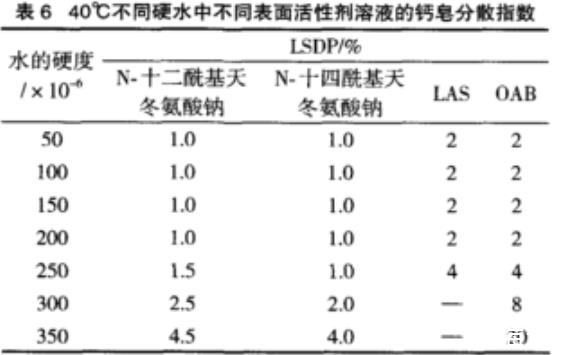 表6 40℃不同硬水中不同表面活性劑溶液的鈣皂分散指數