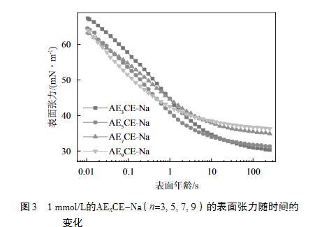前面已經(jīng)討論了溶液平衡時(shí)的特性與規(guī)律,但沒(méi)有考慮平衡及老化的時(shí)間,而時(shí)間因素在實(shí)際應(yīng)用中起著決定性的作用。當(dāng)表面活性劑分子從本體相遷移到表面時(shí),分子的動(dòng)態(tài)吸附性能會(huì)影響表面活性劑的性能。因此,如圖3所示,測(cè)試了1 mmol/L的不同EO加合數(shù)的AEnCE-Na的表面張力隨時(shí)間的變化曲線。
