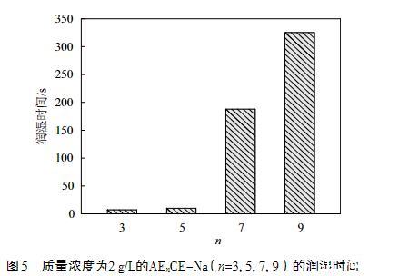 從圖5中可以得到,AEnCE-Na的潤(rùn)濕時(shí)間隨EO加合數(shù)的增大而增大,也就是說(shuō),潤(rùn)濕能力隨EO數(shù)的增大而逐漸減弱,這主要是親水性增強(qiáng)的結(jié)果。其中,AE3CE-Na和AE5CE-Na的潤(rùn)濕時(shí)間均小于10 s,樣品的潤(rùn)濕性能較好。