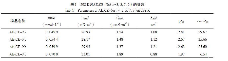 表1 298 K時(shí)AEnCE-Na(n=3,5,7,9)的參數(shù)