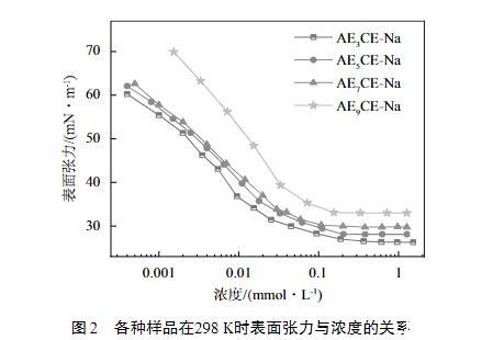 由圖3可以看出,溶液的表面張力都得到了明顯的降低。根據(jù)Rosen理論,表面張力隨時(shí)間的變化依次可分為誘導(dǎo)區(qū)、快速下降區(qū)、介平衡區(qū)和平衡區(qū)4個(gè)區(qū)域。但在系列AEnCE-Na樣品中,都沒(méi)有檢測(cè)到誘導(dǎo)區(qū),說(shuō)明樣品的擴(kuò)散速率都很快,已經(jīng)超過(guò)了儀器的檢測(cè)上線(10 ms)。各個(gè)樣品在檢測(cè)范圍內(nèi)最終的表面張力從大到小依次為:AE9CE-Na>AE7CE-Na>AE5CE-Na>AE3CE-Na,該結(jié)果與平衡表面張力的變化趨勢(shì)相一致。