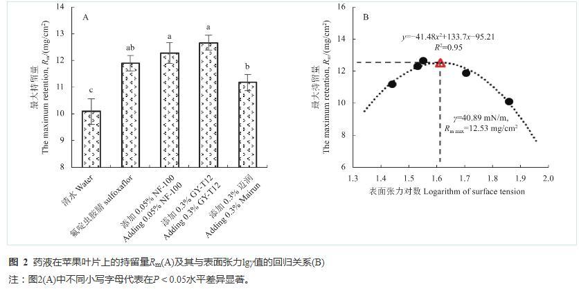 圖2藥液在蘋果葉片上的持留量Rm(A)及其與表面張力lgγ值的回歸關系(B)