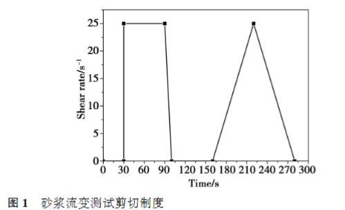 砂漿的流變測試使用Brookfield R/S SST2000流變儀,將測試流動度之后的砂漿立即置于流變儀中,選定設(shè)置好的剪切制度后開始測試,剪切制度設(shè)置如圖1所示。具體過程描述如下:靜置30s后,在剪切速率25s?1下勻速預(yù)剪切60s;然后剪切速率在10s內(nèi)勻速下降至0s?1;靜置60s后,剪切速率以斜坡式在60s內(nèi)逐漸從0s?1提高至25s?1,然后再以斜坡式在60s從25s?1下降到0,采集60個數(shù)據(jù)點。采用剪切速率從25s?1下降到0s?1的過程中的屈服應(yīng)力和表觀黏度作為分析砂漿流變性能的數(shù)據(jù)。