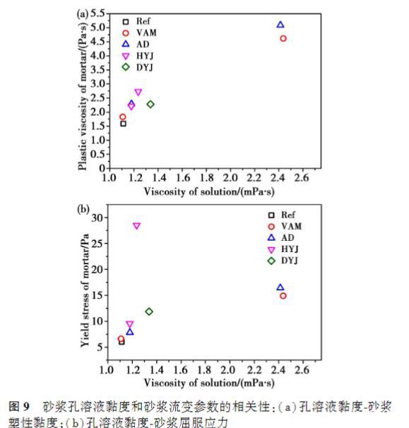 采用改進的Bingham模型對砂漿的流變曲線進行擬合,獲取屈服應力和塑性黏度。當溶液黏度為1.5mPa·s時,砂漿的初始屈服應力和塑性黏度相對于基準砂漿略微增大,60min后的流變參數(shù)出現(xiàn)不同發(fā)展趨勢;當溶液黏度為6mPa·s時,砂漿的屈服應力均高于基準砂漿;VAM和AD砂漿的初始屈服應力高于基準砂漿147%和172%,塑性黏度高出基準砂漿的191%和220%;HYJ和DYJ砂漿的初始屈服應力高于基準砂漿619%和254%,初始塑性黏度高出基準砂漿的64%和82%.