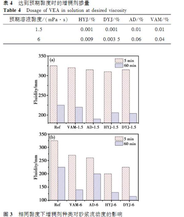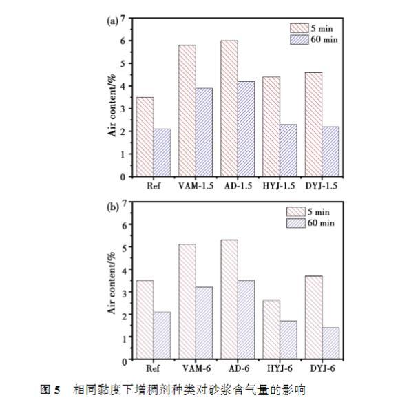 增稠劑溶液的黏度越高,砂漿的流動度越低。在較低黏度下,四種增稠劑對砂漿初始流動度的影響接近,60min時,AD的經(jīng)時流動度最低,VAM流動度相對于基準砂漿略微下降;然而當溶液黏度提高至6mPa·s時,摻入HYJ和DYJ的砂漿流動度顯著低于AD和VAM,60min后的損失也更大,AD的經(jīng)時流動度略低于基準砂漿。