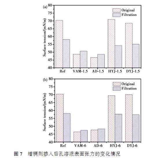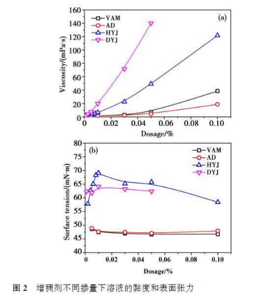 相同摻量下,DYJ的黏度最高,其次是HYJ,VAM和AD黏度在低摻量下接近,摻量達到0.10%之后,VAM黏度高于AD;VAM和AD的黏度隨著摻量的提高緩慢增大,而HYJ和DYJ溶液的黏度隨摻量的提高迅速提高,尤其是DYJ的增長幅度更為顯著。總體來看,增稠劑分子量越大,相同摻量時溶液的黏度越高。從表面張力的結(jié)果來看,相同摻量下,HYJ溶液的表面張力最高,其次是DYJ,VAM和AD的表面張力顯著低于其他兩種增稠劑,且AD略微高于VAM.