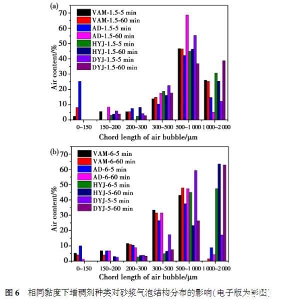 氣泡結(jié)構(gòu)測試表明,砂漿黏度越高,氣泡結(jié)構(gòu)集中于較大尺寸范圍內(nèi)。隨著時間推移,高黏度體系下,500——1000μm的氣泡含量顯著下降,而1000——2000μm的氣泡含量則顯著提高;低黏度體系下,300——500μm的氣泡含量有所增大。