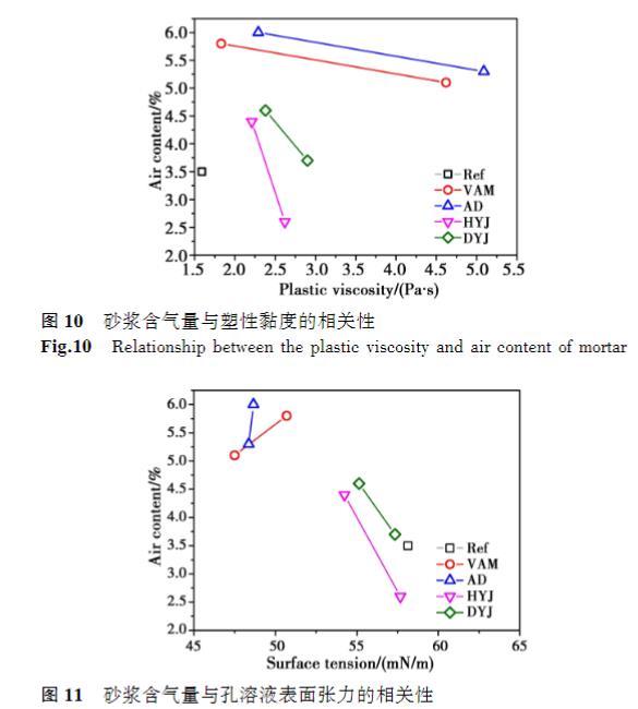 當溶液黏度為1.5mPa·s時,VAM和AD的摻入使砂漿初始含氣量相對于基準砂漿增大66%和71%,而HYJ和DYJ僅使初始含氣量提高26%和31%;當溶液黏度為6mPa·s時,VAM和AD的摻入使砂漿初始含氣量相對于基準砂漿增大46%和51%,而DYJ僅使初始含氣量提高6%,HYJ則降低含氣量26%.