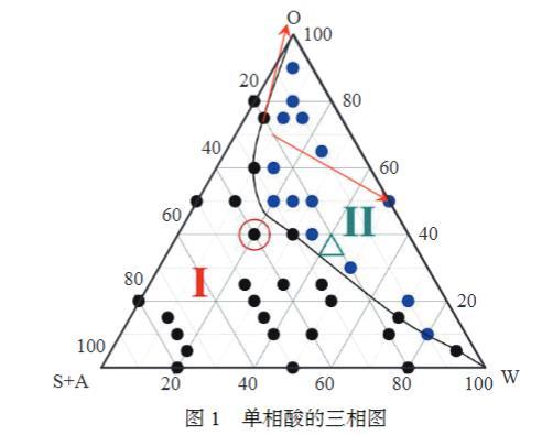 通過擬三元相圖制備單相酸相圖,根據(jù)油相(O)、酸相(W)、表面活性劑(S)+助表面活性劑(A)的比例進(jìn)行三相圖的繪制。室溫下,固定油相(O)的加量,固定非離子表面活性劑(S1)與陽離子表面活性劑(S2)的質(zhì)量比,固定表面活性劑(S,S=S1+S2)與助表面活性劑(A)的質(zhì)量比。將不同比例下的液體進(jìn)行離心,然后進(jìn)行觀測,觀察體系由澄清透明(一相)變?yōu)榛鞚幔ǘ啵┑南嘧冞^程,在每次發(fā)生相變的同時記錄所滴加鹽酸的量,以O(shè)、S+A、W為三相,繪制擬三元相圖,見圖1。由圖1可知,在圖1的紅圈標(biāo)記區(qū)域,配方的經(jīng)濟(jì)性最好,是維持單相區(qū)域最小的表面活性劑用量(S+A),且該配方下的單相酸遇水遇油后仍可在較大范圍內(nèi)保持單相。