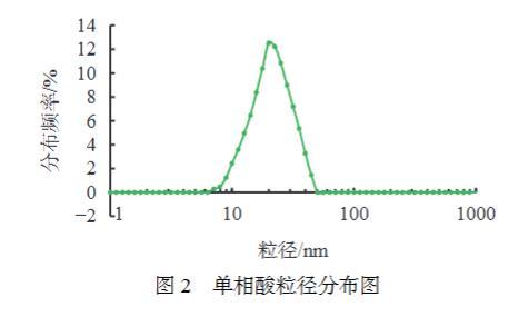 采用激光粒度分析儀對單相酸粒徑及分布進(jìn)行了測定,實驗結(jié)果見圖2。可知單相酸粒徑大小分布在7~50 nm范圍之內(nèi),分布較窄,為高斯分布,在單相微乳粒徑范圍內(nèi)。