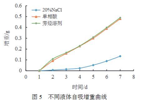 設(shè)置不同液體進(jìn)行自吸實驗,對比親油巖心對于不同液體的自吸能力,實驗結(jié)果見圖5。對孔隙介質(zhì)而言,潤濕性控制兩相或多相流體的分布和流動。平衡時濕潤相與孔隙表面相互接觸,而非濕相占據(jù)孔隙的中央位置,介質(zhì)中發(fā)生兩相或多相流動時,毛管力與濕相流動方向一致,是非濕相自發(fā)進(jìn)入巖心介質(zhì)驅(qū)替潤濕相的阻力,對于油濕巖心介質(zhì),很難發(fā)生水的自吸。從實驗結(jié)果可以看出,單相酸自吸效果和芳烴溶劑十分接近。