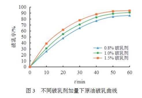 將單相酸與原油高速攪拌混合制備乳狀液,油水比3∶2。分別加入0.8%、1.0%、1.5%二酸二辛脂磺酸鈉破乳劑,水浴90℃,靜態(tài)放置,每隔10 min測量析出量,計算破乳率,實驗結(jié)果見圖3。加入1%破乳劑后,單相酸破乳率在1 h內(nèi)可達(dá)到90%以上。