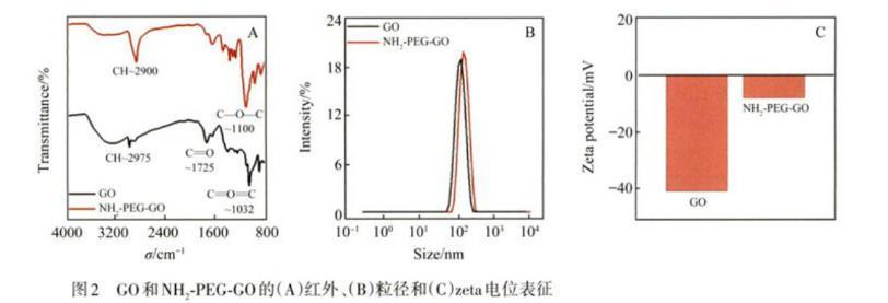 圖2 GO和NH2-PEG-GO的(A)紅外、(B)粒徑和(C)zeta電位表征