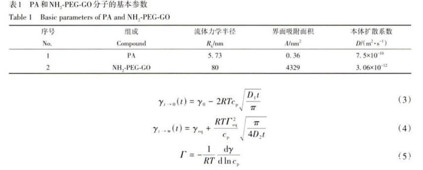 這些吸附解析特征由NH2-PEG-GO和PA的尺寸差異引起。NH2-PEG-GO納米片尺寸相比于PA較大,其在水溶液中擴散系數D=3.06×10-12 m2/s比PA分子在正辛烷中的擴散系數小2個數量級(表1和輔助材料圖S1、圖S2)。因此,PA分子擴散到界面速率快,會優先吸附到界面上,PA分子的親水羧基會靠近水相,疏水烷基鏈伸向油相。而當NH2-PEG-GO分子貼近水-油界面時,其親水長鏈PEG-NH2會先接觸界面,然后疏水平面逐漸平行于界面,最終使疏水基面與界面接觸。這種界面取向為GO在界面的最小自由能狀態,能夠大面積地覆蓋水-油界面。