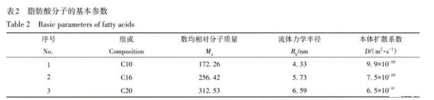 當(dāng)利用不同鏈長的脂肪酸與NH2-PEG-GO協(xié)同穩(wěn)定水-油界面張力時,界面張力的降低需要考慮來自烷基鏈結(jié)構(gòu)對界面張力的影響:研究發(fā)現(xiàn)脂肪酸的烷基鏈越長,其在界面排列的有序度越高,烷基鏈傾向于垂直于界面排列,在界面形成更緊密堆積的吸附層。同時還發(fā)現(xiàn),脂肪酸的親水羧基在界面上存在兩種不同的狀態(tài),即未解離的—COOH和帶負(fù)電荷的—COO-。當(dāng)正辛烷中脂肪酸的質(zhì)量濃度增加時,吸附在水-油界面上的脂肪酸分子間距離將逐漸拉近,此時脂肪酸分子疏水烷基鏈之間的范德華吸引相互作用以及—COOH與—COO-基團(tuán)之間的離子-偶極吸引相互作用隨之增強(qiáng),并且發(fā)現(xiàn)這兩種吸引相互作用將隨烷基鏈長度的增加而增強(qiáng),而吸引相互作用的增強(qiáng)也會縮短脂肪酸分子間距離,有利于分子在界面形成致密吸附層,從而有效降低界面張力。這可以解釋在添加高質(zhì)量濃度脂肪酸時,長鏈脂肪酸能更有效地降低界面張力的現(xiàn)象。