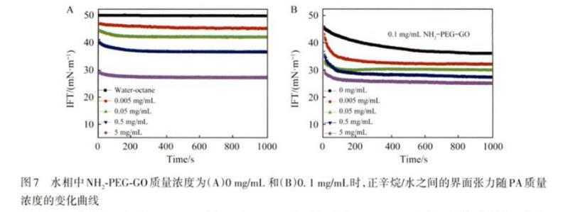 固定NH2-PEG-GO質(zhì)量濃度(0.1 mg/mL),分析改變正辛烷溶液中PA質(zhì)量濃度時界面張力的變化情況。動態(tài)界面張力的演變?nèi)鐖D7所示,當(dāng)正辛烷中PA質(zhì)量濃度小于5 mg/mL時,即使加入微量的NH2-PEG-GO(0.1 mg/mL)就能夠顯著降低界面張力,相比于不添加NH2-PEG-GO時的情況降低了約15 mN/m。然而,隨著PA質(zhì)量濃度的增加(0.005~5 mg/mL),界面張力僅從32 mN/m降低到25 mN/m(圖7B)。在不添加NH2-PEG-GO時,隨PA質(zhì)量濃度增加(0.005~5 mg/L),界面張力的下降值則約為20 mN/m(圖7A)。這表明NH2-PEG-GO的添加使得PA在界面上吸附減少,NH2-PEG-GO成為降低界面張力的主導(dǎo)因素。然而隨著PA質(zhì)量濃度升高,PA的界面吸附量逐漸達(dá)到飽和,少量NH2-PEG-GO的存在不會顯著降低界面張力。當(dāng)PA的質(zhì)量濃度達(dá)到5 mg/mL時,存在0.1 mg/mL NH2-PEG-GO僅比不存在時降低了約2 mN/m,這是由于此時界面被PA占滿,沒有足夠的空間供NH2-PEG-GO進(jìn)行吸附。
